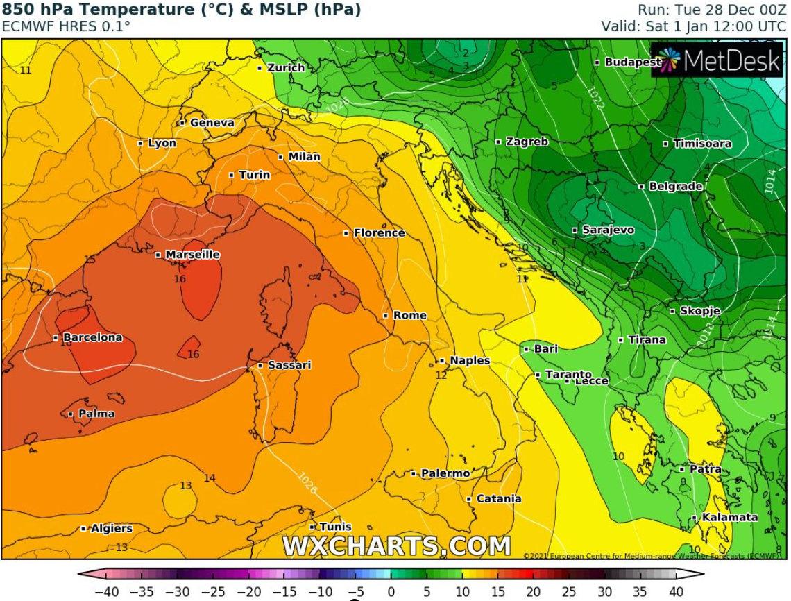 Ultimi giorni di Dicembre e primi giorni di Gennaio 2022 caratterizzati da una vasta area Anticiclonica di matrice Africana che avvolgerà il Mediterraneo centro occidentale e gran parte d'Europa. L'Anticiclone Africano si posizionerà con il suo centro sia al suolo che in quota proprio nel Mediterraneo tra le Baleari e l'Italia con valori di pressione al suolo superiori a 1025 hPa ed un richiamo caldo in quota più tipico di fine Primavera inizio Estate con valori proprio per Capodanno vicino a 15°C alla quota di 1500 metri su Sardegna, Liguria e Nord Ovest e zero termico fin verso i 3500/4000 metri. Le temperature risulteranno quindi ben al di sopra delle medie stagionali specialmente dove splenderà il sole ed in collina e montagna in quanto sulla Pianura Padana assisteremo ad inversioni termiche nei bassi strati con la formazione di nebbie diffuse ma senza rischio di gelate con la temperatura al suolo che si manterrà tra 4/7°C anche con nebbia.