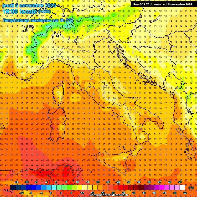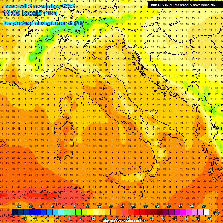 Temperature generalmente stazionarie con punte massime locali di 21°C su Sardegna e Sicilia.
