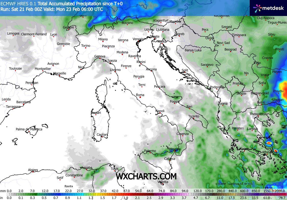 Nel pomeriggio occasionali precipitazioni sulle Alpi nord di confine, variabile su Calabria e Sicilia orientale, prevalenza di sole sul resto del Paese. Quota neve sulle Alpi settentrionali attorno a 900/1000 metri.