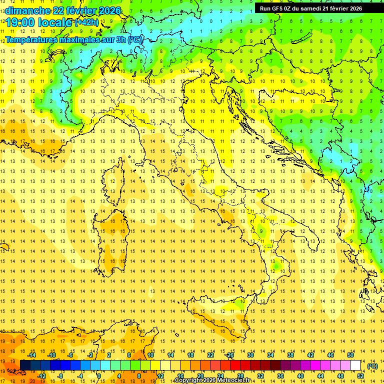 Temperature in aumento sulle Alpi, in lieve diminuzione lungo l'Adriatico, in aumento sulle Isole Maggiori, generalmente stazionarie altrove. Punte massime locali di 16°C su Sardegna e Sicilia.