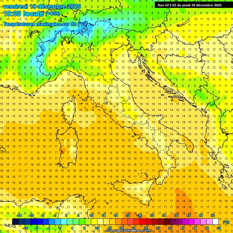 Temperature in lieve diminuzione con punte massime locali di 17/18°C su Sicilia e Sardegna.