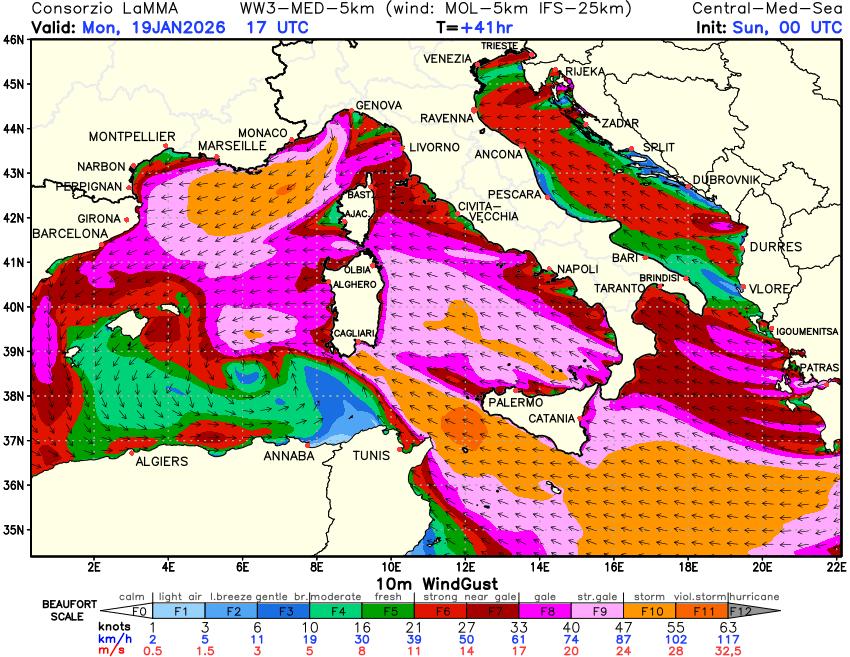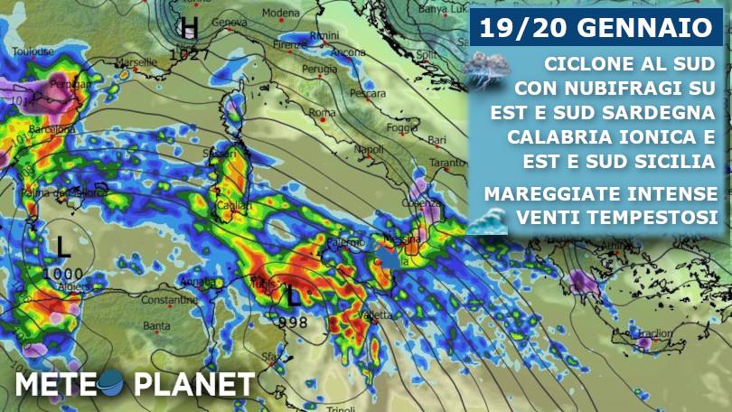 Oltre a nubifragi il ciclone provocherà anche una forte tempesta di vento con raffiche anche oltre 100 km/h e intense mareggiate con onde fino a 6 metri specie su Sardegna meridionale e sud orientale. Sicilia orientale e Calabria ionica meridionale.