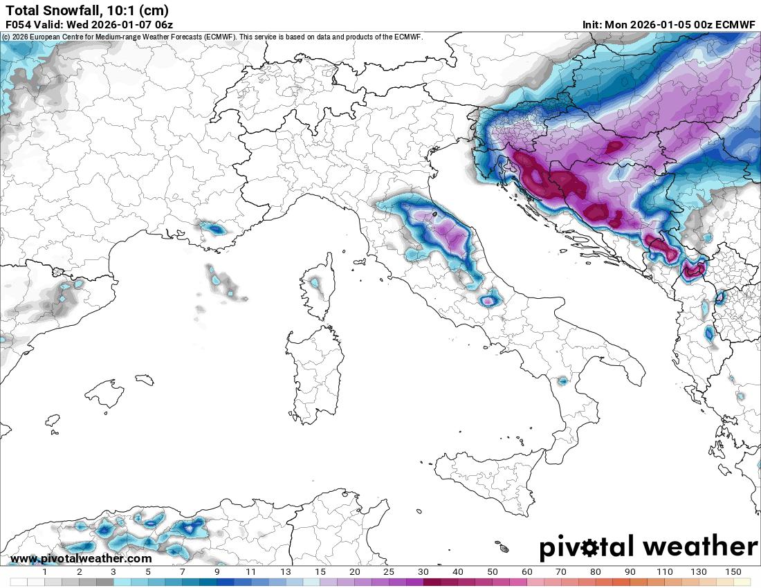 Venti moderati da NE su alto Adriatico, moderati da W sul Mare di Sicilia, ciclonici al Centro, moderati da S su Ionio e Puglia centro meridionale, variabili altrove. Quota neve su Appennino centrale attorno a 300/900 metri, su Emilia Romagna fin in pianura.