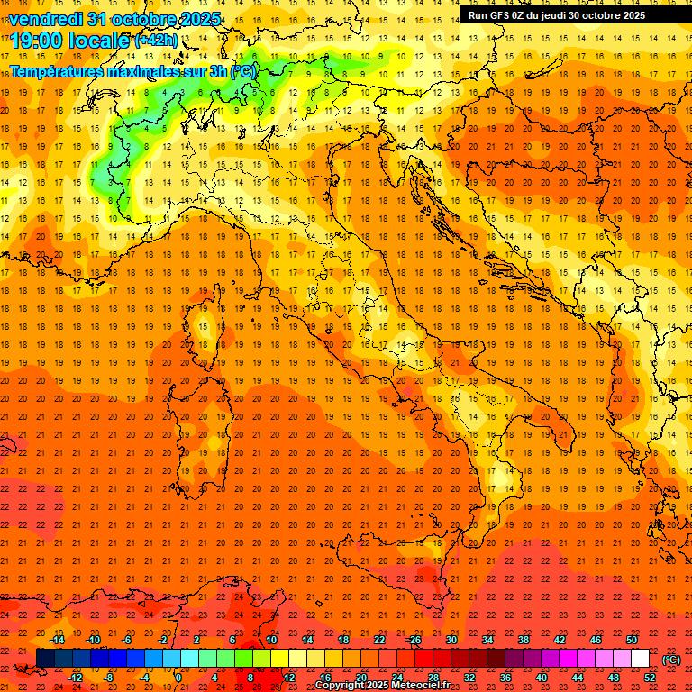 Temperature in lieve diminuzione al Nord Est e Sardegna, generalmente stazionarie altrove. Punte massime locali di 23°C su Sicilia orientale ed adriatiche centrali.