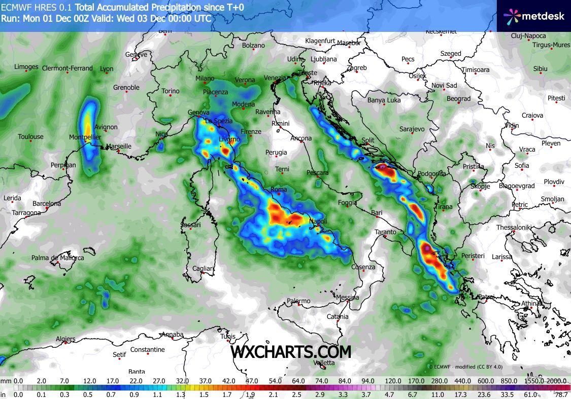 La settimana si manterrà instabile, con alternanza di schiarite e nuove piogge. Un peggioramento più significativo è probabile dalla seconda parte di mercoledì al Nord Ovest e parte del Sud e poi giovedì 4 dicembre su varie zone del paese, quando la saccatura Atlantica si spingerà più in profondità sul Mediterraneo portando alla formazione di un minimo depressionario sul Mediterraneo centro occidentale.
