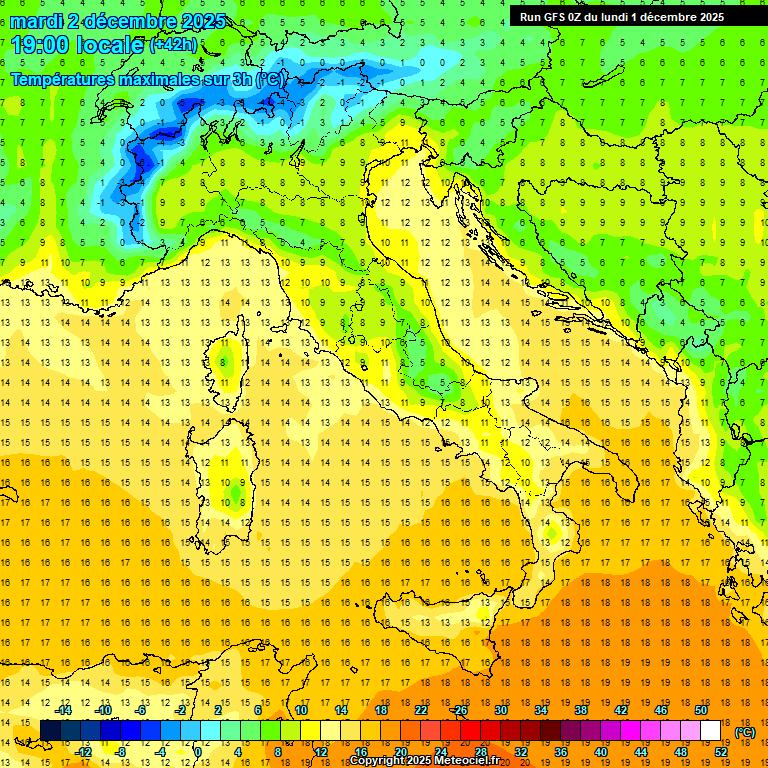 Temperature in diminuzione al Centro e Sardegna, generalmente stazionarie altrove. Punte massime locali di 17/18°C su Puglia meridionale e Sicilia sud orientale.