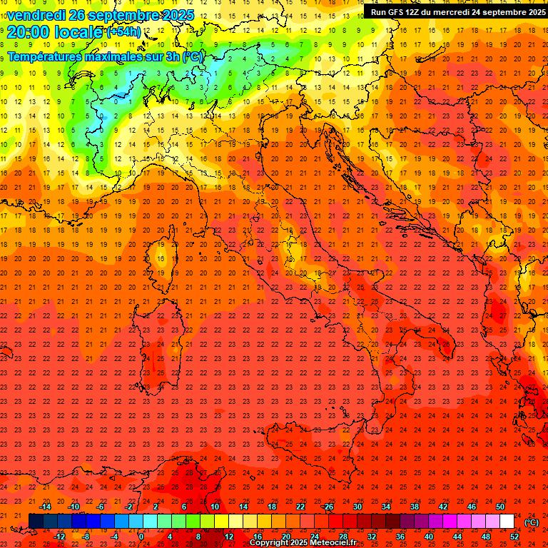 Temperature in ulteriore lieve diminuzione su Alpi, Nord Ovest ed al Sud, generalmente stazionarie altrove. Punte massime locali di 27°C su Sicilia e Sardegna meridionale.