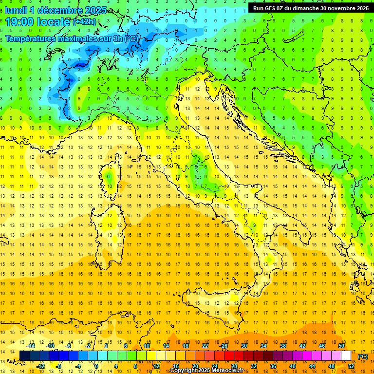 Temperature in diminuzione al Nord e Sardegna, in lieve diminuzione su Appennino settentrionale e alta Toscana, stazionarie altrove. Punte massime locali di 16/17°C su Sardegna meridionale e Sicilia sud orientale.