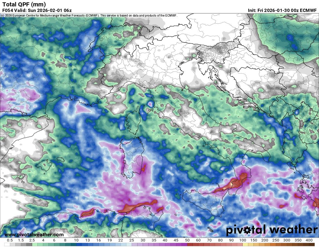 In mattinata precipitazioni locali su nord Sicilia, Calabria tirrenica, Campania, Toscana, Alpi del Piemonte e Valle d'Aosta, occasionali su Sardegna occidentale, variabile altrove. Nebbia in Val Padana con gelate. Quota neve sulle Alpi occidentali attorno a 1000/1400 metri.