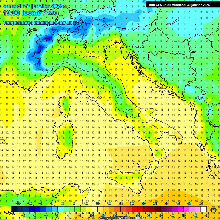 Temperature in diminuzione al Centro Nord, stazionarie al Sud. Punte massime locali di 15/16°C su Sicilia e Puglia meridionale.