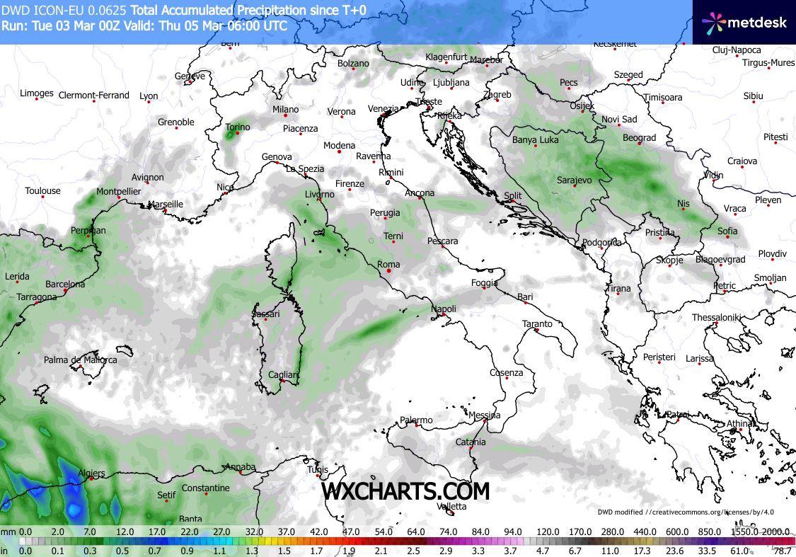 Tra giovedì e venerdì qualche pioggia su Sicilia e Sardegna e locali sull'estremo Nord Ovest.