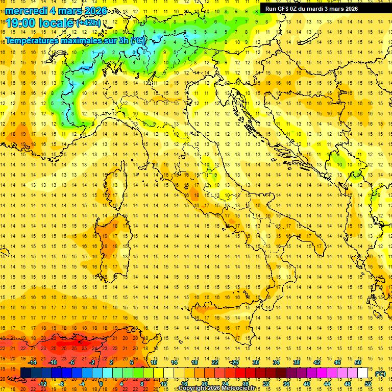 Temperature in aumento su Sardegna e Sud Italia, stazionarie od in lieve aumento altrove. Punte massime locali di 20/21°C sulla Sardegna.