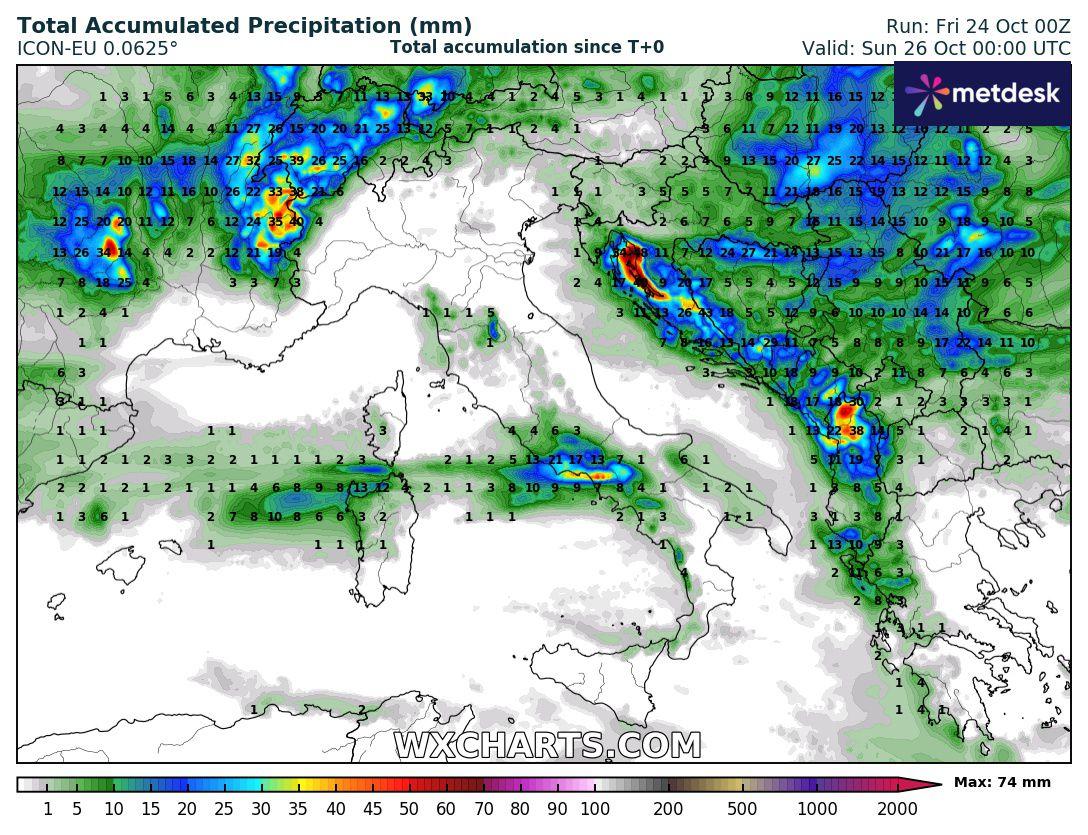 In mattinata precipitazioni sparse su Valle d'Aosta, Alpi occidentali del Piemonte e alta Toscana, locali su Lazio ed Appennino centro settentrionale, occasionali sulla Sardegna nord occidentale, variabile sui restanti settori tirrenici ed Alpi occidentali, generalmente poco nuvoloso altrove.