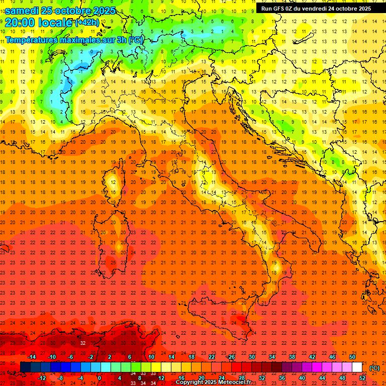 Temperature in diminuzione su tutte le zone con punte massime locali di 24/25°C su Sicilia orientale, Calabria ionica e Puglia meridionale.