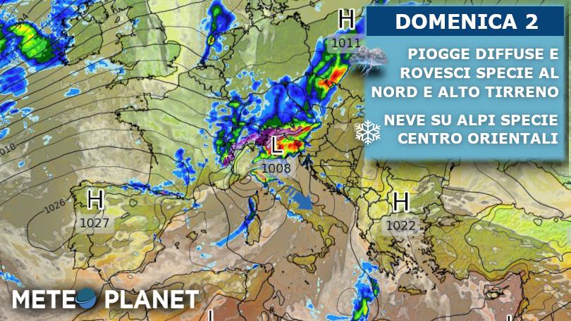 In mattinata precipitazioni diffuse su Lombardia, Trentino Alto Adige, Veneto occidentale, Liguria centro orientale, Emilia occidentale ed alta Toscana, sparse sul resto del Nord Ovest, resto del Veneto e Friuli Venezia Giulia, locali sul resto dell'Emilia e della Toscana, da poco nuvoloso a variabile sulle restanti zone. Quota neve sulle Alpi oltre i 2000 metri.
