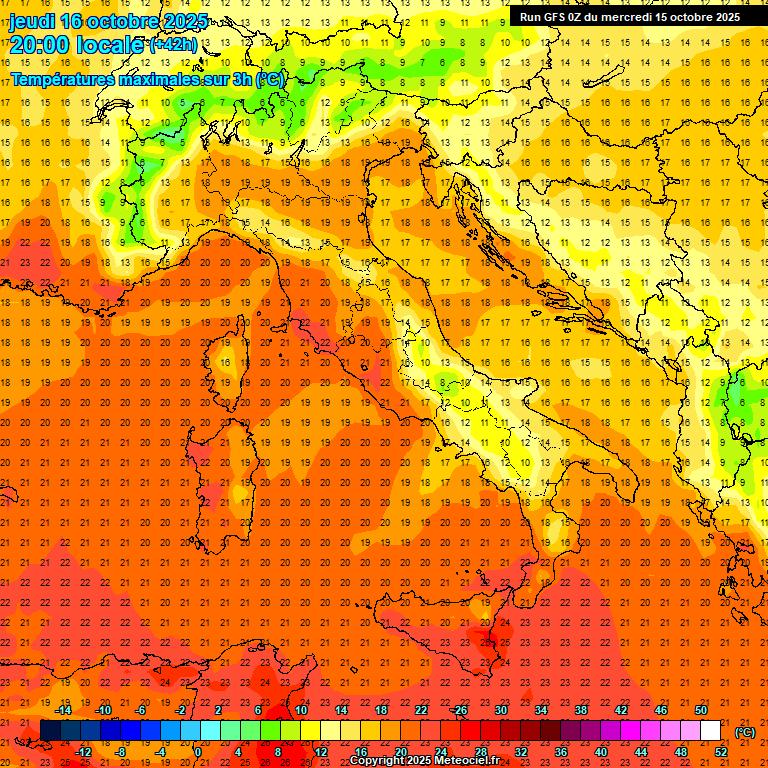 Temperature in diminuzione al Centro Sud, in lieve diminuzione al Nord. Punte massime locali di 26°C sulla Sardegna meridionale.