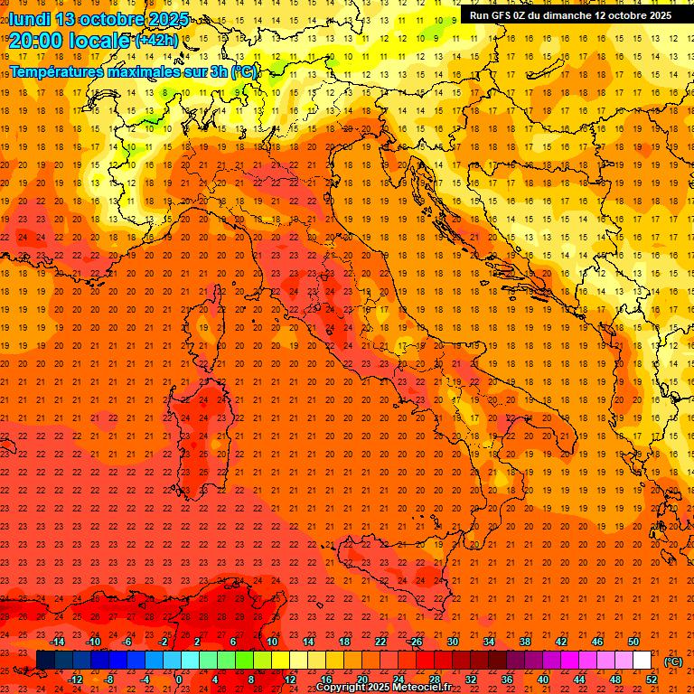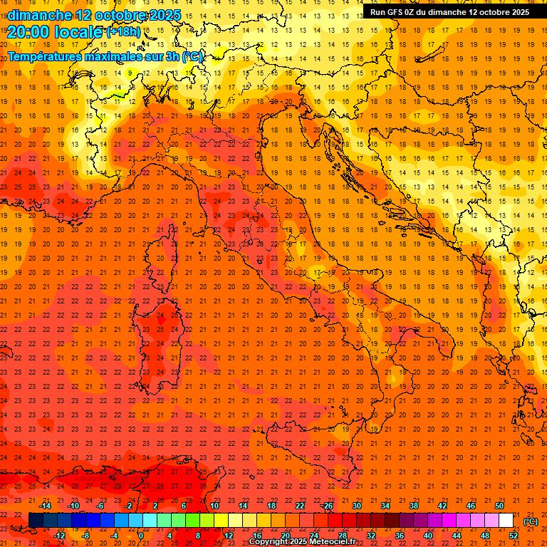 Temperature in lieve diminuzione al Centro Sud, stazionarie al Nord. Punte massime locali di 25/26°C su Sardegna e Toscana.