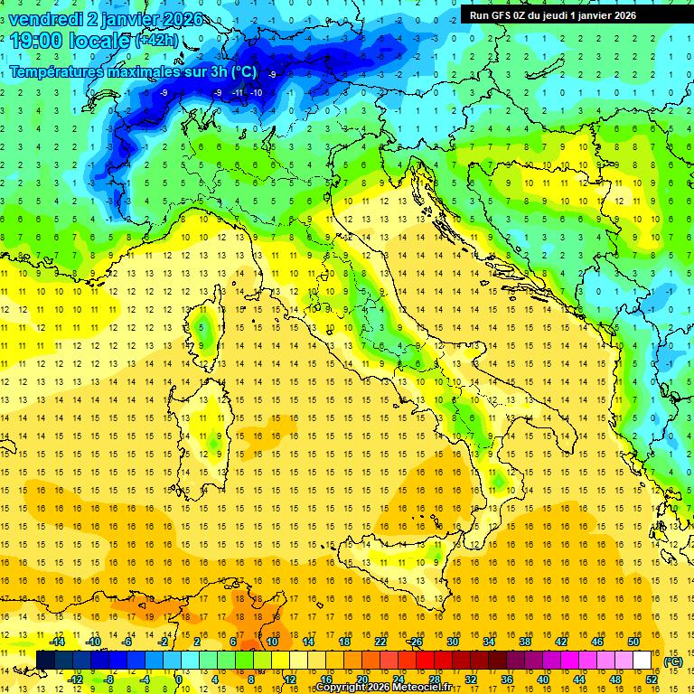 Temperature in aumento al Centro Sud, generalmente stazionarie al Nord. Punte massime locali di 15 Sicilia, Calabria tirrenica meridionale e Sardegna.