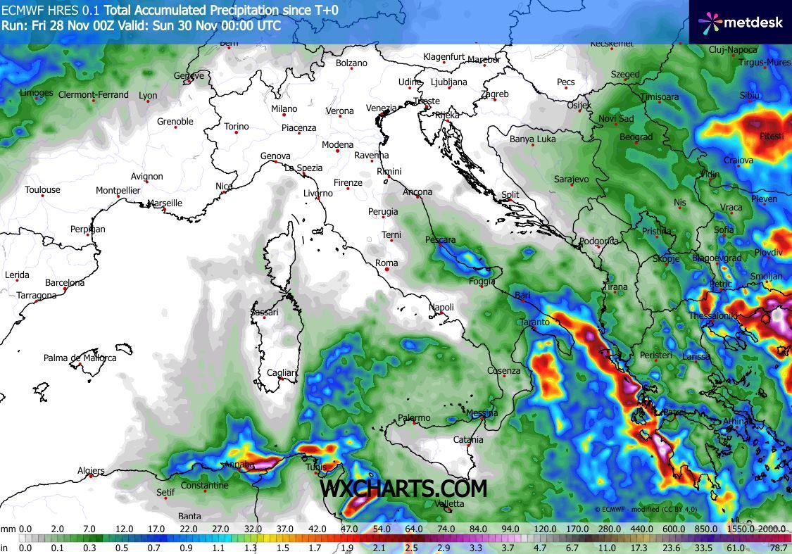 Nel pomeriggio precipitazioni sparse su Puglia centro meridionale e Basilicata, locali su Calabria ionica e nord Sicilia, variabile sul resto del Sud, Abruzzo e Molise, generalmente sereno o poco nuvoloso altrove.