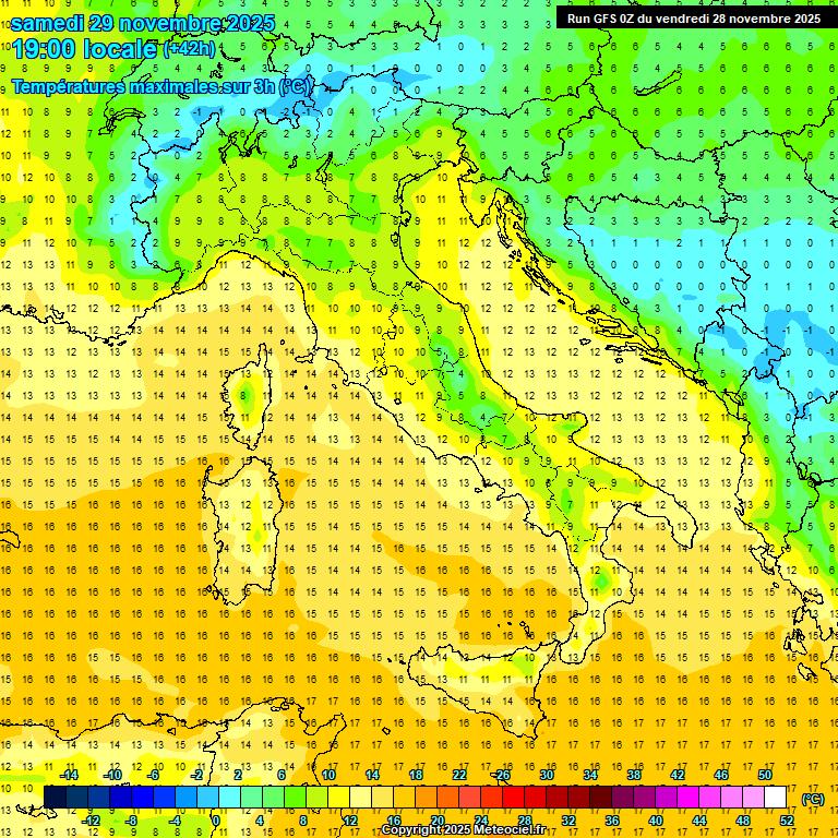Temperature in aumento sulle Alpi, stazionarie od in lieve diminuzione altrove. Punte massime locali di 15°C su Puglia meridionale e Sicilia sud orientale.
