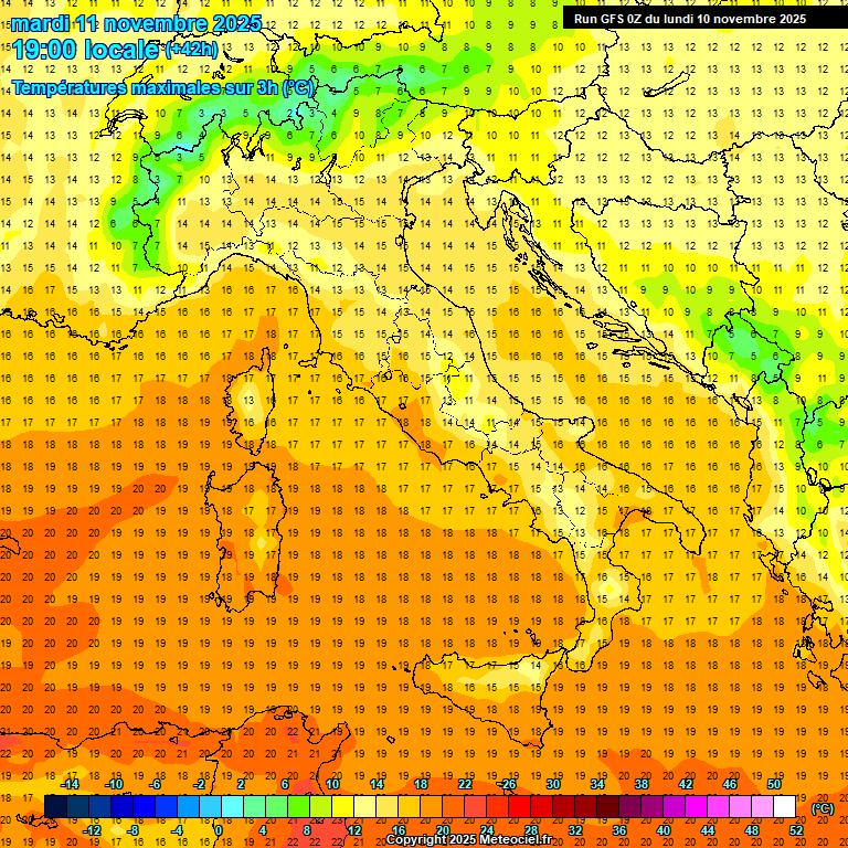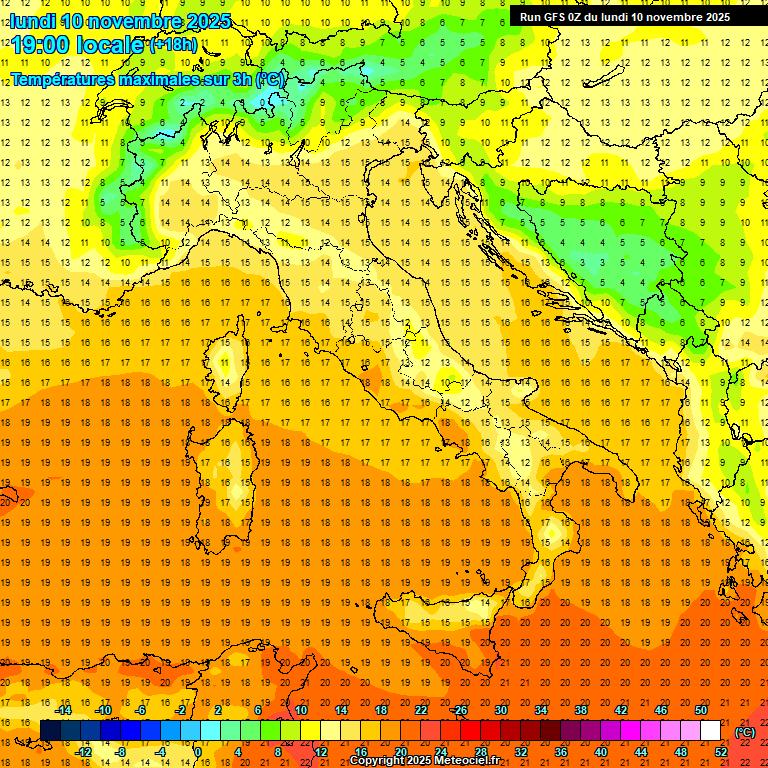 Temperature stazionarie su gran parte delle zone, in lieve diminuzione su Sicilia e parte del Sud. Punte massime locali di 20°C sulla Sardegna.