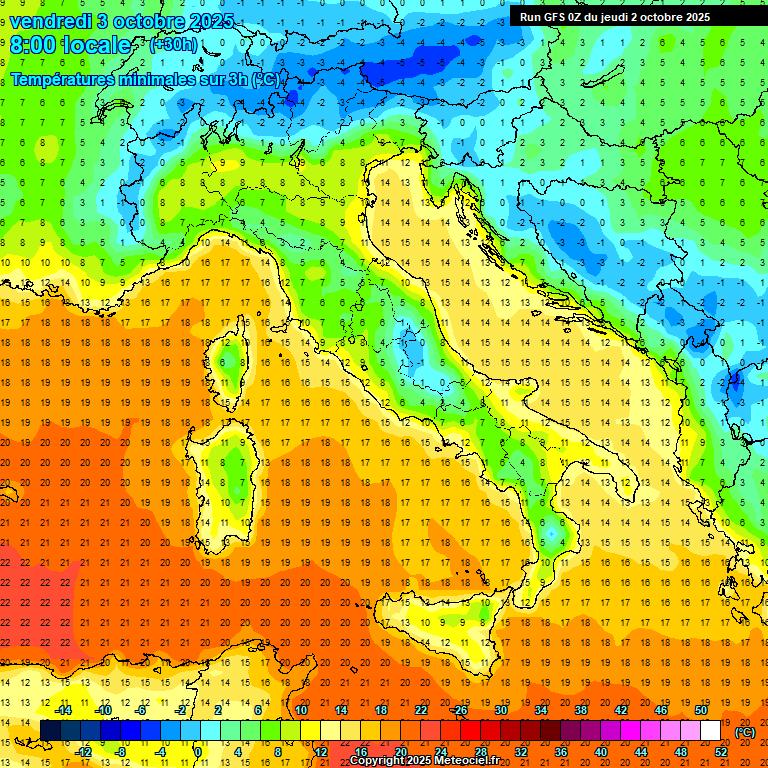 Temperature in ulteriore lieve diminuzione al Sud, stazionarie al Centro, in lieve aumento le massime al Nord. Punte massime locali di 23°C sulla Sardegna meridionale.