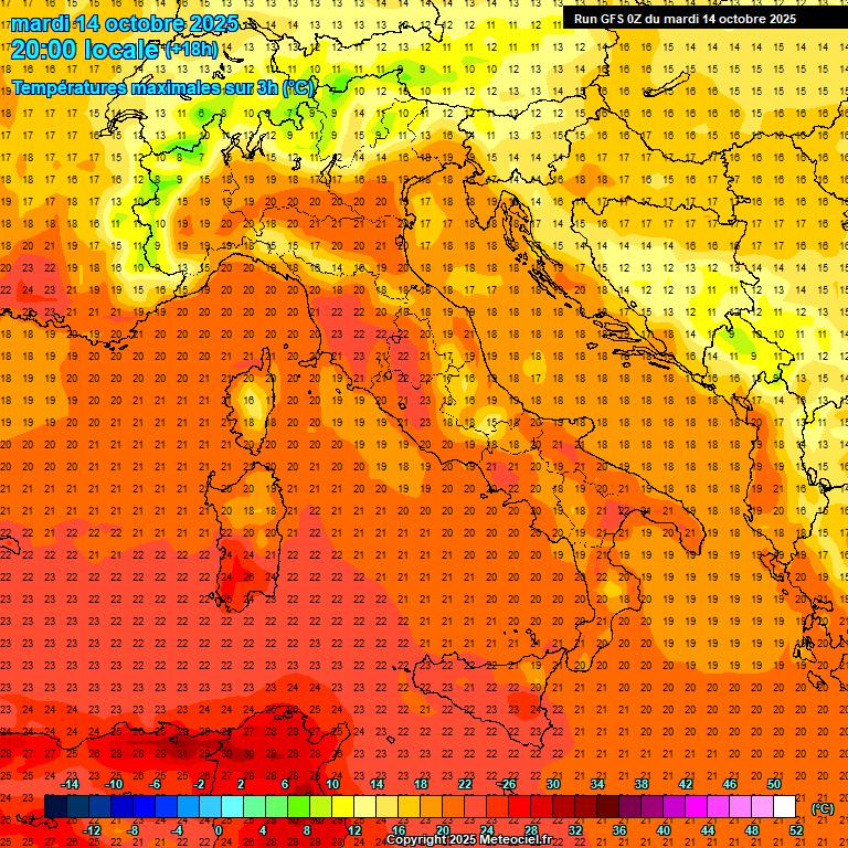 Temperature in lieve diminuzione sulle Alpi, generalmente stazionarie altrove con punte massime locali di 25°C su Sardegna e Sicilia.