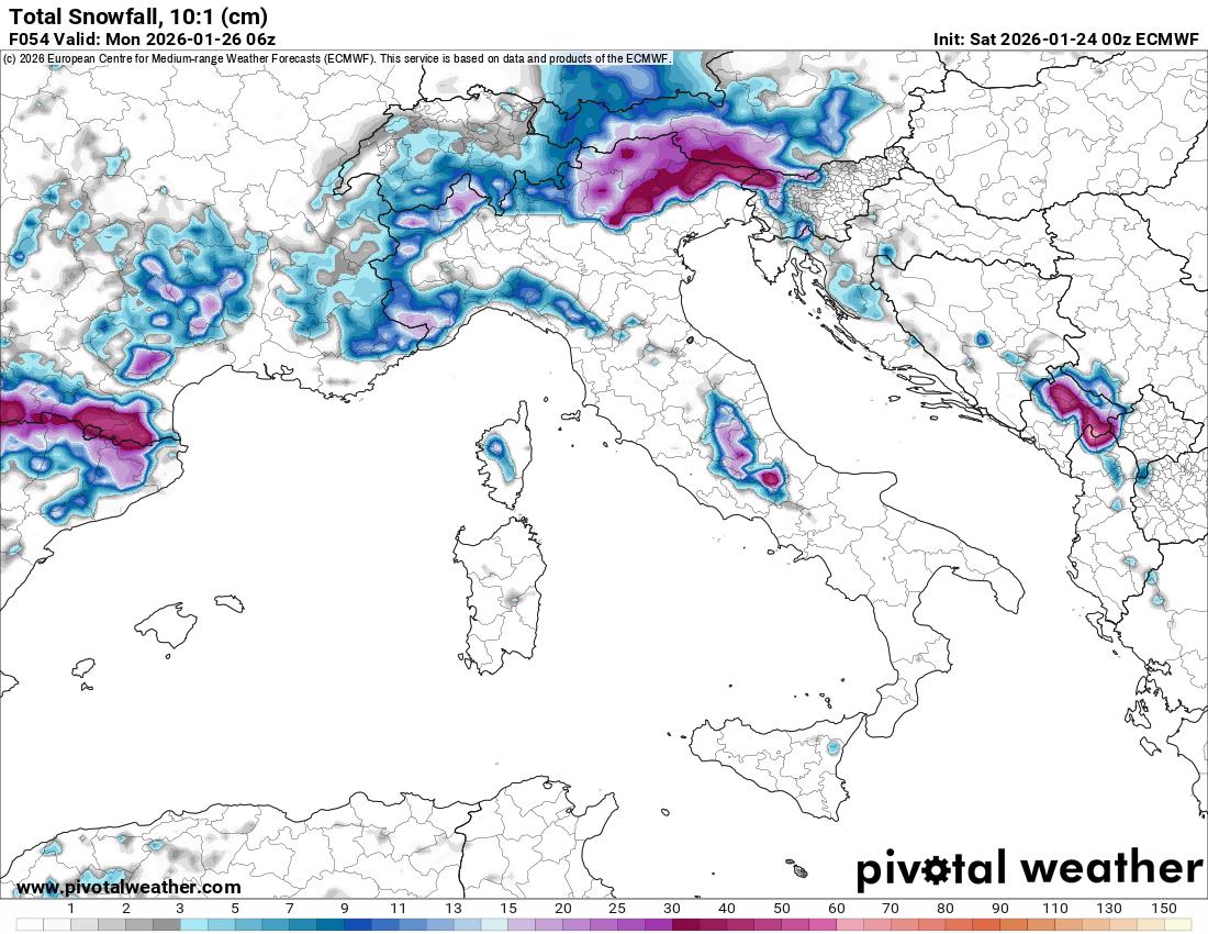 Al Nord nevicate inizialmente a quote molto basse specie al Nord Ovest, Trentino Alto Adige e Piacentino con episodi di neve o neve mista pioggia fin verso i 200/300 metri poi in rialzo domani oltre 800/1000 metri. Neve anche su Appennino centro settentrionale oltre 1000/1300 metri.