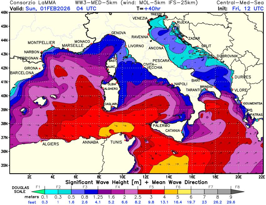 Mari da molto mosso ad agitato lo Stretto di Sicilia, molto mossi Mare di Sicilia, Mar di Sardegna, Tirreno meridionale e Ligure occidentale, da poco mossi a mossi i restanti bacini occidentali e Ionio orientale, generalmente calmi i restanti mari.