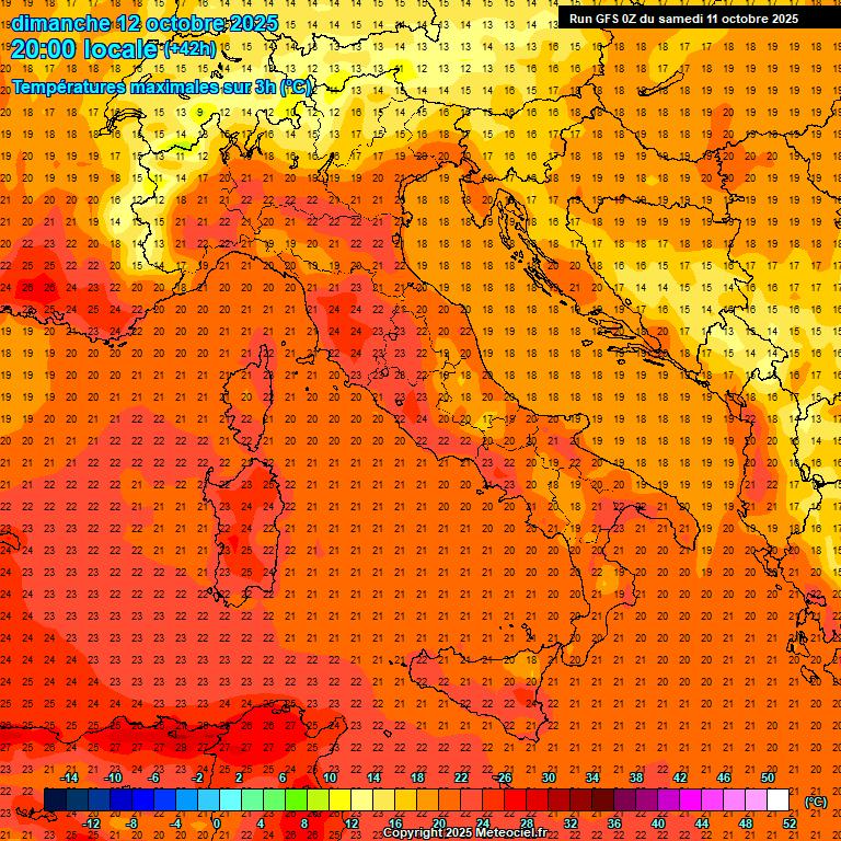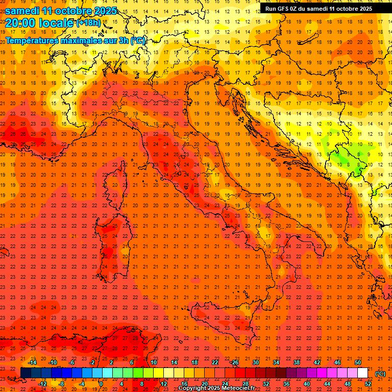 Temperature in lieve diminuzione al Centro Sud, stazionarie al Nord. Punte massime locali di 25/26°C su Sardegna e Toscana.