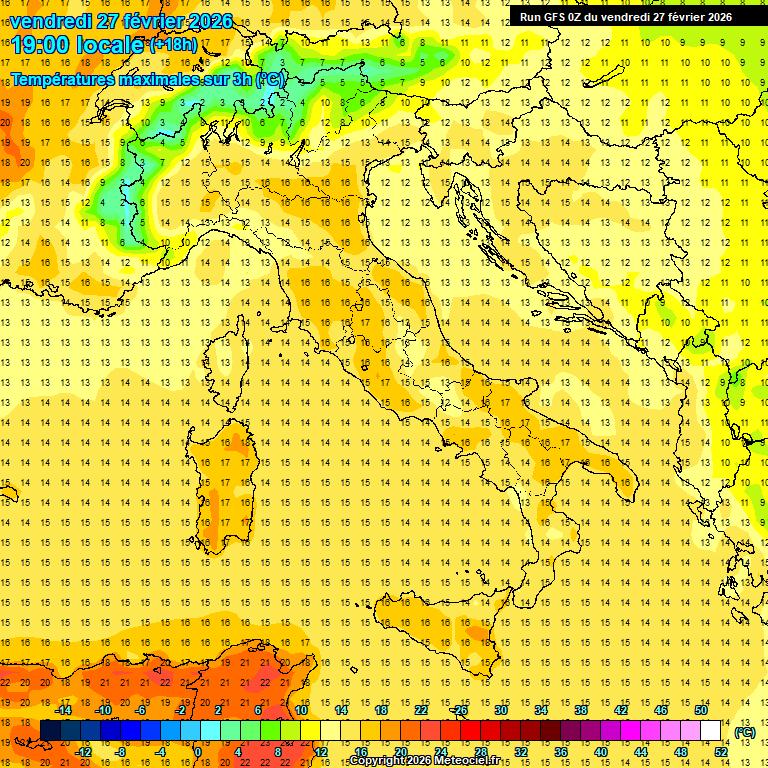 Temperature generalmente stazionarie su tutte le zone con punte massime locali di 18/19°C su Sicilia, Sardegna e Basilicata.